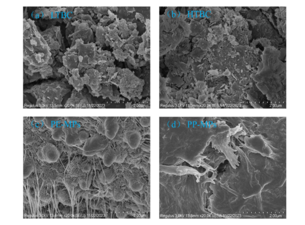 �1.生物炭(BC)和微塑料(MPs)的微观形态与官能团特征。包含扫描电子显微镜(SEM)图像(a,b,c,d)和傅里叶变换红外光谱(FTIR)图(e)�