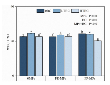 低温生物炭(LTBC�450℃热解)在微塑料污染土壤中能通过交互作用提高玉米的水分利用效率(WUE);而高温生物炭(HTBC�800℃热解)则产生不利影响,尤其在添加聚丙烯微塑料(PP-MPs)的土壤中�