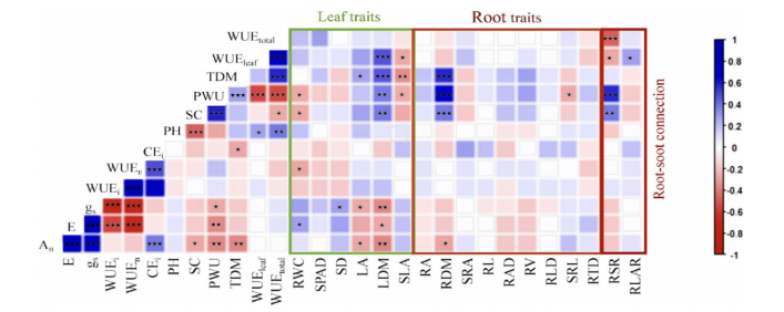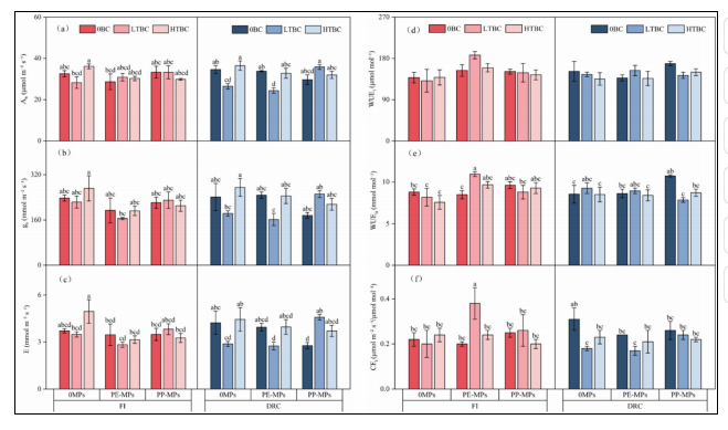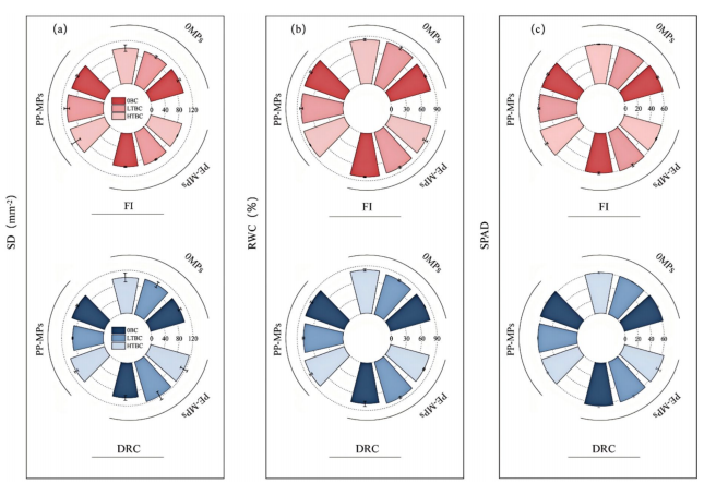 DRC放大了生物炭和微塑料对玉米形态生理特征的改变。例如,在DRC条件下,聚乙烯微塑料(PE-MPs)增加了总干物质(TDM)、叶片及整株的WUE�