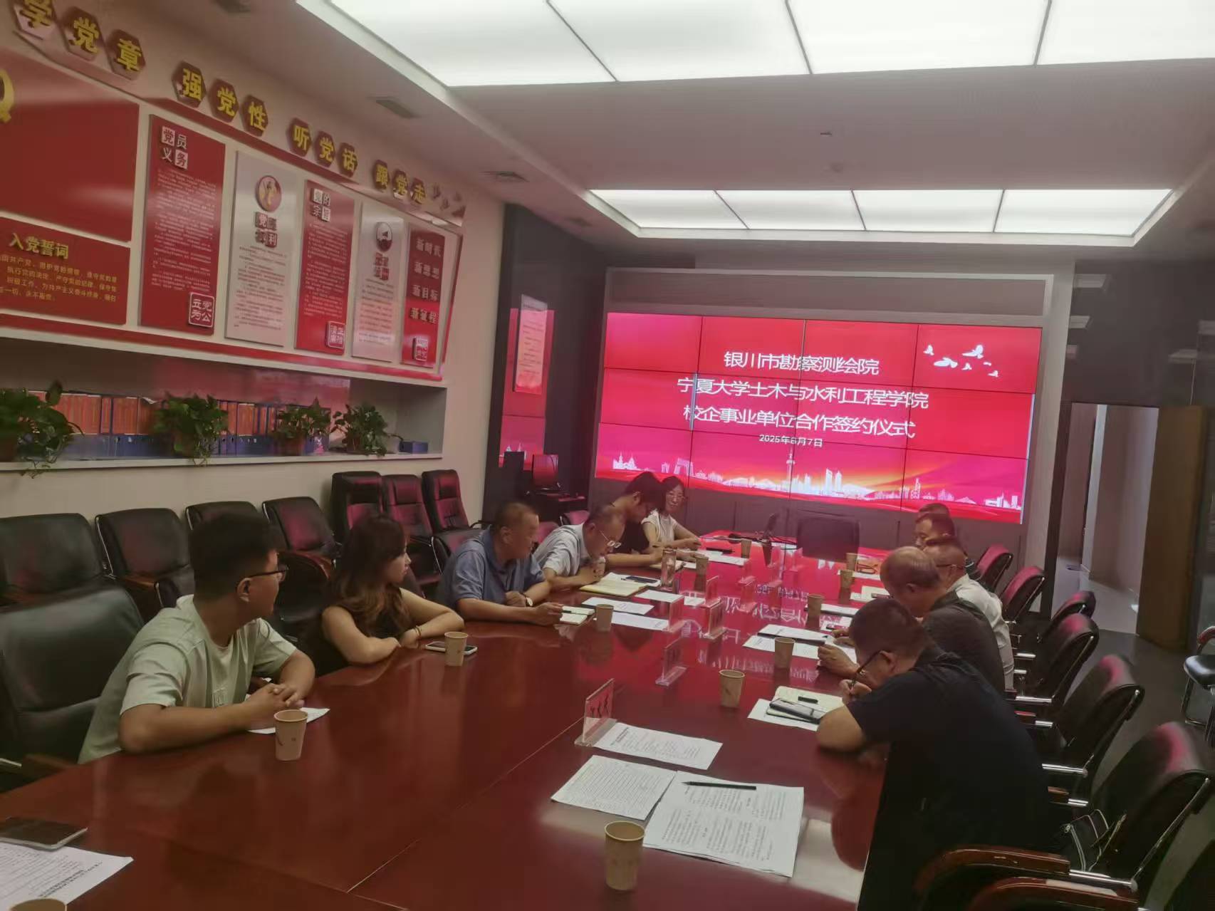2025�8�8日,宁夏大学土木与水利工程学院院长毛明杰率队赴银川市勘察测绘院开展深度交流座谈,宁夏测绘院院长董军率领导班子成员接待毛明杰院长一行,会议在银川市自然资源局一号会议室举行,双方聚焦人才培养、技术协作与产学研融合,共绘校企合作发展蓝图�