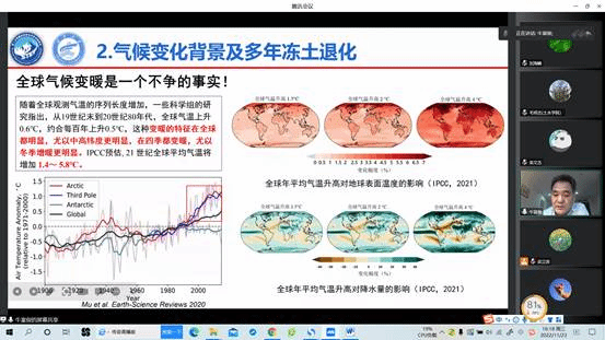 报告第一部分,牛富俊研究员介绍了青藏高原科学考察的重要意义:青藏高原是世界屋脊、亚洲水塔,是地球第三极,是我国重要的生态安全屏障、战略资源储备基地,是中华民族特色文化的重要保护地;第二部分,介绍了气候变化背景及多年冻土退化方面的研究前沿及成果;第三部分,结合最新的研究成果介绍了冻土退化的环境及灾害效应;第四部分以青藏工程走廊冻融灾害诱发工程病害类型为例介绍了冻土退化的工程病害效应;第五部分介绍了服务重大冻土工程建设与安全运营,保障区域绿色可持续发展的适应与应对策略。