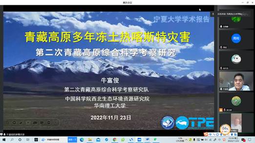 师生做主题为“青藏高原多年冻土热喀斯特灾害”的线上学术报告,报告会由毛明杰院长主持,学院师生200余人参加了报告会。