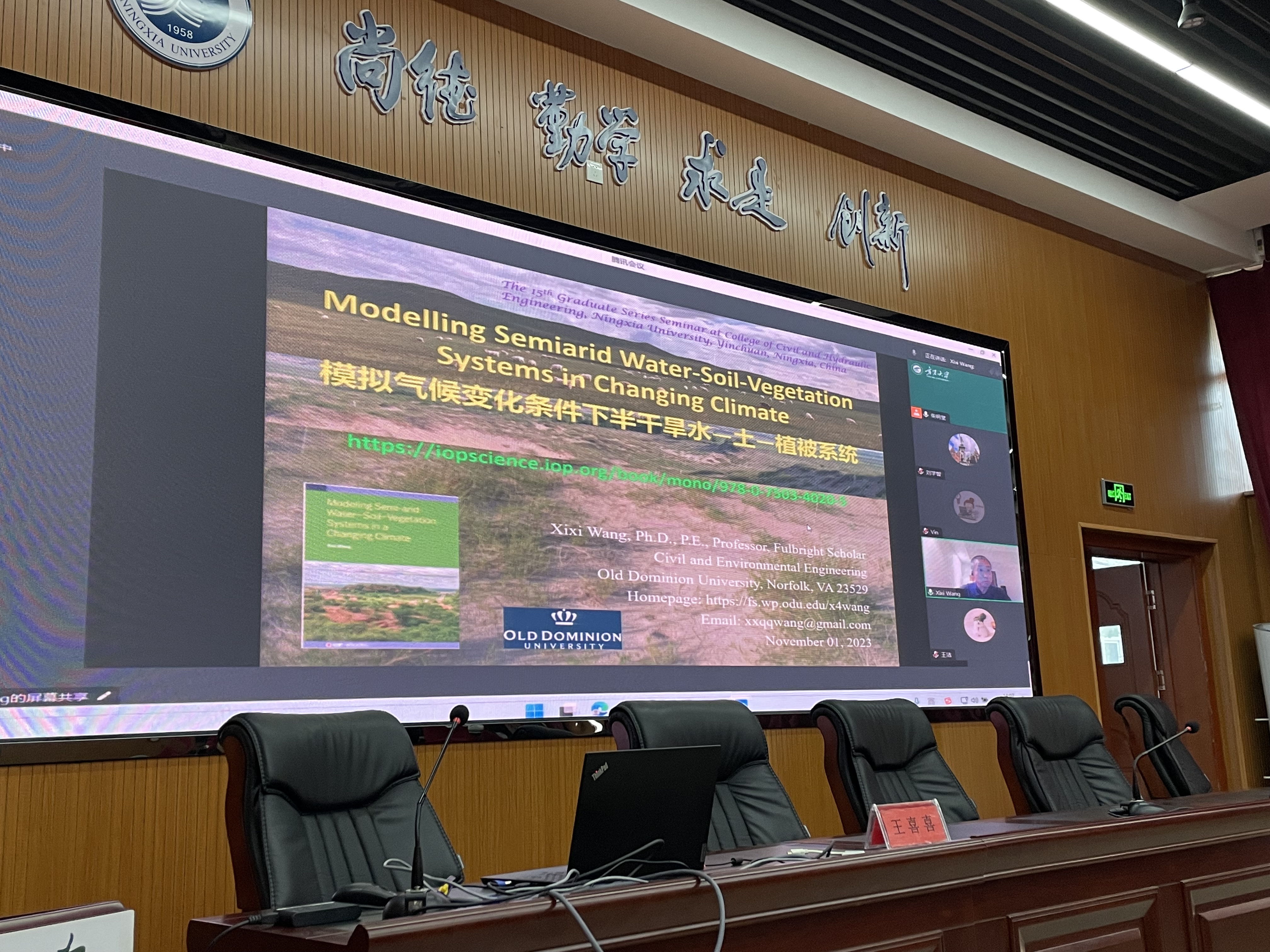 第十五届研究生学术论坛召开,美国欧道明大学土木与环境工程系王喜喜教授应邀为学院师生做题为“Modelling Semiarid Water-Soil-Vegetation Systems in Changing Climate(模拟气候变化条件下半干旱水-土-植被系统)”的学术报告。报告会由院党总支书记尹娟主持,线上线下同步的方式进行,现场有院党总支副书记徐利岗、副院长李王成及水利系师生160余人参加,另有200余人通过线上方式参加了报告。