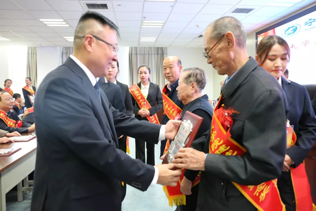 毛明杰向退休老教师颁发纪念奖牌