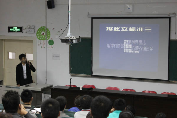 华南区域公司招聘主管郑超首先讲述了五年前同为就职者“石头”的求职经历及工作履历,由此拉近了与同学们的距离,使会场气氛轻松活跃。随后,他重点阐述了充满激情、勇于担当、开阔思维、激流勇进的员工核心价值观并以纪录片的形式向在座各位应聘者引出该公司的领军人物——董事长龚静漪。另外,他介绍了本公司良好的工作氛围及优越的工作环境,及企业立体培训体系。对同学们普遍关切的薪酬福利等相关问题亦做出详细解答。