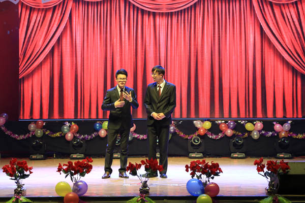 的2015级新生表示热烈欢迎。迎新晚会正式开始,整个晚会精彩纷呈,高潮迭起,表演形式丰富,内容新颖。歌舞、相声、小品、手风琴、吉它乐器联奏等精彩的节目为观众呈现了丰盛的视听盛宴。随着强劲的音乐声响起,晚会在马芊菂、马园、张雅姝等演员激情的开场舞《Catch me if you can》中拉开了帷幕。歌伴舞《青花瓷》展示着东方独特的文化神韵,“中国风”旋律响彻全场;而相声《趣谈大学》以诙谐打趣的方式演绎了大一新生心中无限感慨,手风琴合奏奏出了别样美妙的旋律,一支《竹林深处》把观众带入奇幻的世界。一波小高潮后是博士生导师献花环节,感谢多年来孜孜不倦在一线从事教学科研的老师们为学院人才培养、学校发展做出的贡献。