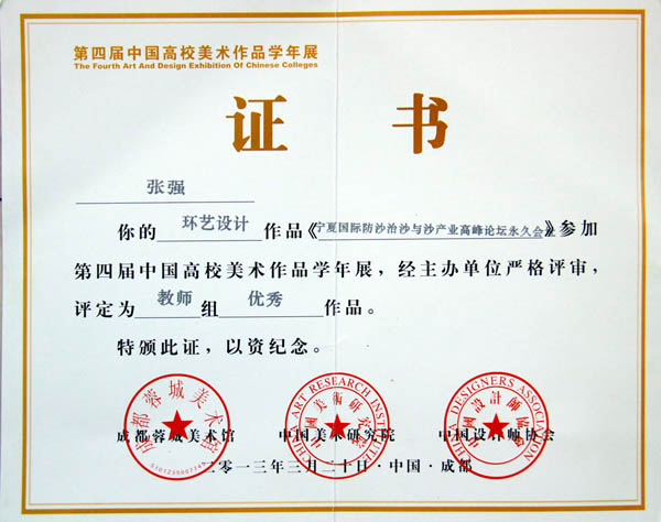 2013年3月,在由中国美术研究院、中国设计师协会、成都蓉城美术馆举办的“第四届中国高校美术作品学年展”中,性爱游戏 建筑与规划系教师张强的环艺设计作品“宁夏国际防沙治沙与沙产业高峰论坛永久会址”和摄影作品《小镇》,被评定为教师组优秀作品奖。同时,这两幅作品由第四届学年展组委会推荐,入编大型年度出版物《中国创意设计年鉴》正式出版。