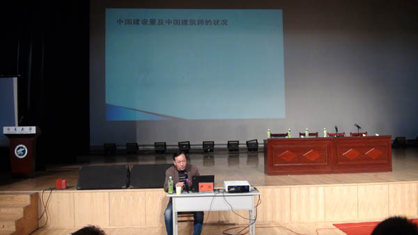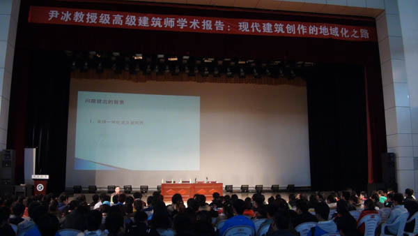 报告中尹冰先生结合自己主持设计的“宁夏银川阅海中央商务区国际会议中心”、“银川工会大厦”、“吴忠图书馆”三个项目案例,从设计理念、地域文化、民俗背景、建设场地、周边环境、功能组成等内容出发,对三个不同功能要求的公共建筑设计进行了详尽的评析、说明。重点从区域环境角度分析了宁夏地区建筑的应有特色,从而提出“尊重自然和地域特点,结合本地文化、技术、材料及民俗特征的建筑才能称为好建筑”、“本土建筑应当反映本土文化”等重要观点。