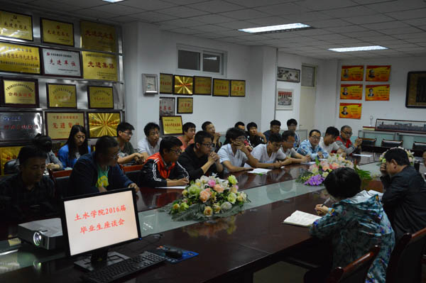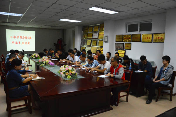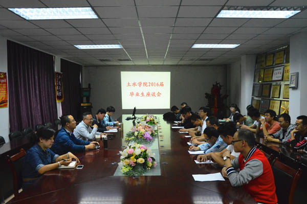 2016届毕业生座谈会在工科楼四楼会议室举行。土水学院党委书记马正亮、院长毛明杰、党委副书记陆瑜、学办主任郭利、教学办主任白俊英及2016届本科、硕士研究生毕业生代表参加了此次座谈会。