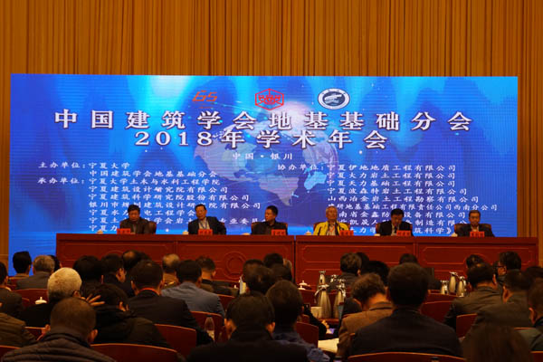 由宁夏大学与中国建筑学会地基基础分会主办,宁夏大学土木与水利工程学院、宁夏建筑设计研究院有限公司等单位承办,宁夏伊地地质工程有限公司等单位协办的中国建筑学会地基基础分会2018年学术年会开幕式�10�25日上午在银川悦海宾馆会议中心举行�