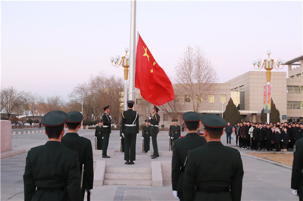 在激昂雄壮的国歌声,鲜艳的五星红旗在贺兰山校区德勤楼前冉冉升起,迎风飘扬,全体师生肃立注目、奏唱国歌。