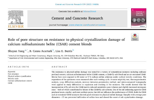 [1]YangS.Y.,CansuB., BurrisL.Role of pore structure on resistance to physical crystallization damage of calcium sulfoaluminate belite (CSAB) cement blends. Cement and Concrete Research, 2022,159(06):106886.