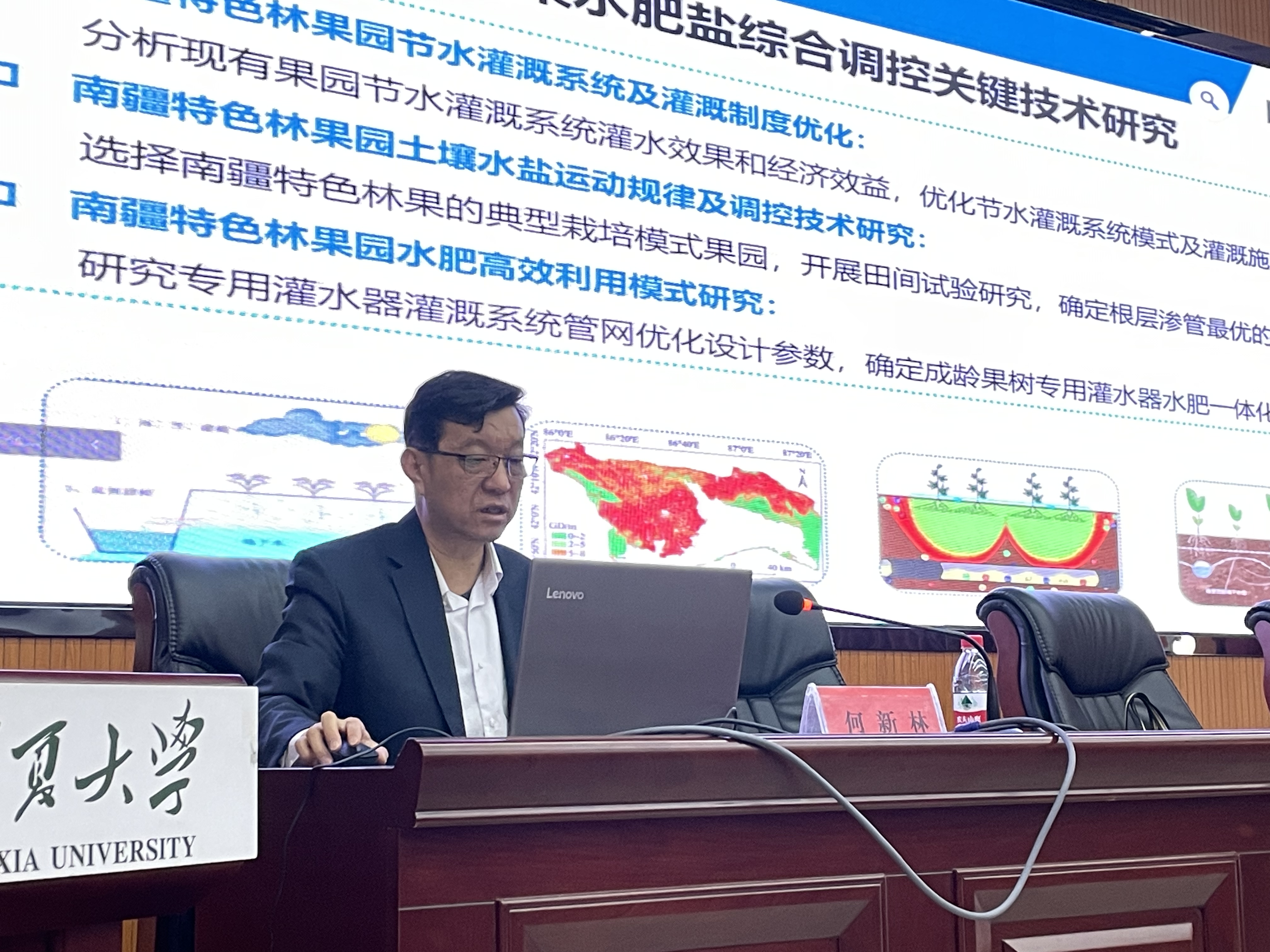 何新林教授从流域水循环和新疆特色林果节水灌溉技术两大方面,介绍了内陆河典型流域水循环的研究历程、取得主要成果及其应用价值;以及葡萄和香梨高效节水灌溉技术研究进展、未来研究方向等。何新林教授在报告中对新疆特有的山盆结构及其生态过程、水文循环过程及水盐运移机理及调控技术进行深入的讲解,并展示了研究团队产出的高水平成果和转化应用技术情况。