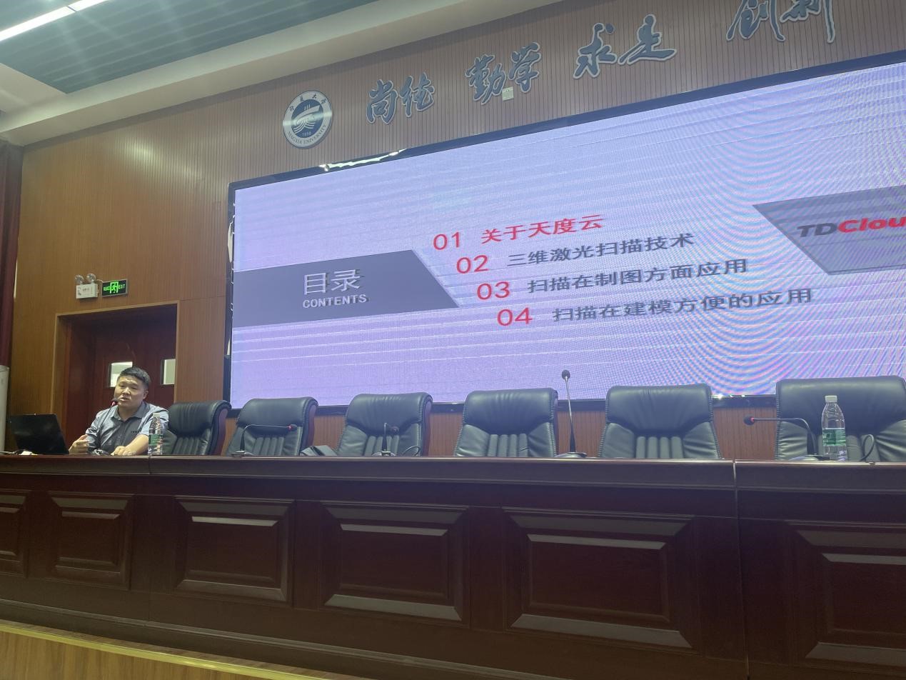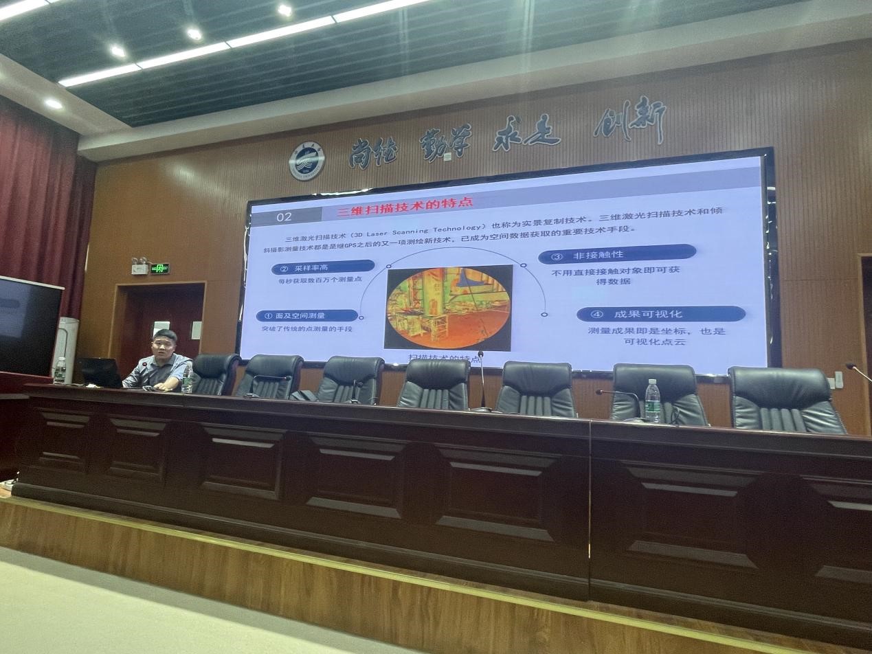王炳亮老师首先介绍了到访的企业专家,简单介绍了举办本次讲座的初衷和目的。随后,特邀讲师天度智云总经理王俊,结合技术团队在大数据、人工智能、地理遥感信息、扫描测绘等高新科技领域的具体项目案例,系统介绍了数字技术赋能工程建设的历史沿革和应用现状,重点讲述了三维激光扫描技术原理、应用流程以及应用效果,以三维扫描技术构建工程实体高精度模型为例,全面呈现了工程领域新质生产力发展动态和趋势。讲座图文翔实、影音素材丰富生动,开拓了师生视野,激发了学习水利工程高新技术的浓厚兴趣�