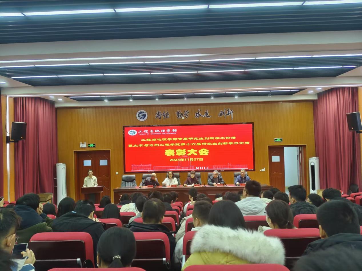2024�11�27日,工程与地理学部首届研究生创新学术论坛暨土木与水利工程学院第十六届研究生创新学术论坛表彰大会在文萃校区知行楼三阶报告厅举行。宁夏大学研究生院副院长常娟,工程与地理学部副部长、土木与水利工程学院院长毛明杰,学院党总支书记尹娟、副院长刘海峰、李王成及获奖研究生出席了表彰大会�
