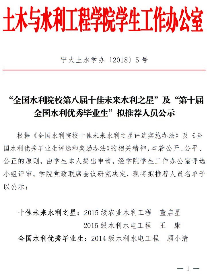 “全国水利院校第八届十佳未来水利之星”及“第十届全国水利优秀毕业生”拟推荐人员公示