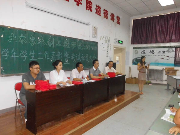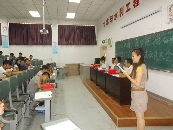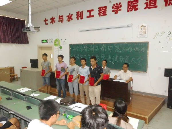 2013-2014学年学生工作表彰暨考试动员大会于C区工科楼第三阶梯教室隆重举行。土水学院党委副书记张强,学生办公室主任郭利,团委书记叶新才,2013级年级主任车佳玲,党建办公室王锋峰参加了此次会议。大会由郭利老师主持。