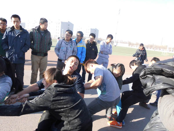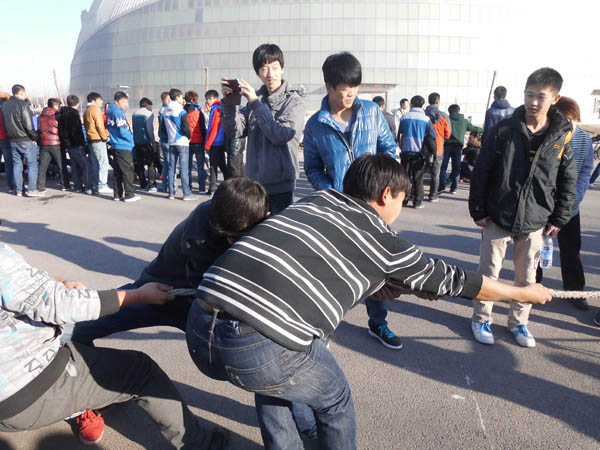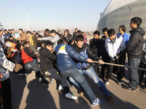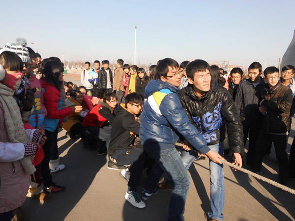 为促进班级间交流、提高团体凝聚力,2013年12月11日下午性爱游戏 举办迎新生拔河比赛。比赛过程中,气氛异常紧张。各班的啦啦队热情火爆,为参赛同学增添了不少信心。加油声、呐喊声,充斥在校园上空,久久的回荡。即使是寒冬时节,依然没有抹杀学生们的热情,比赛气氛被一次又一次的推向高潮。农水班获得此次比赛的冠军,城规班与建筑班分别荣获亚军、季军。