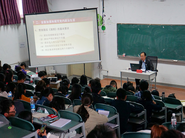 李福明老师幽默风趣的自我介绍赢得大家阵阵掌声。上课开始,李福明老师从十一届三中全会对我国的影响的讲解引出并强调党的十八届六中全会的重要性。随后,李福明老师分别从党的十八届六中全会的重大意义和主要精神、全面加强和规范党内政治生活、全面落实党内监督责任、突出抓好领导干部特别是高级干部四个方面对大家做出讲解,援引举例,精彩绝伦。李福明老师还对当今局势进行分析讲解,对历史上的反腐的研究以及对人民生活水平的提到和党的政策的给予肯定。最后,历时两个小时党课在一片掌声中结束。