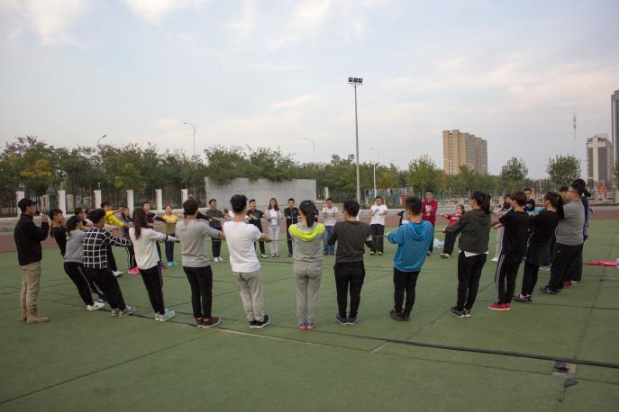 随后,教练要求每个队分别选取队长,确定队名,设计口号、Logo、队歌、团队造型等。十五分钟后,三个队长选举出炉,并为大家介绍了讨论的成果。三个队伍分别取名为“英雄联盟队”“爱对不队”和“拆迁队”。在队长介绍的过程中,活动场上传来此起彼伏的笑声,略显陌生的学生干部开始变得融洽,无形的默契渐渐形成。