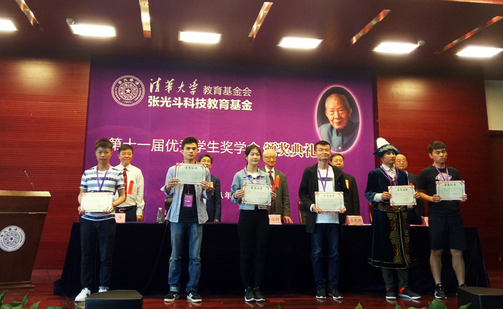 在颁奖礼开始前,嘉宾与参会师生共同观看了回忆张光斗先生的纪录片“情系山河,辉煌人生”,以及“张光斗科技教育基金十周年”的纪念短片。出席会议的有张光斗科技教育基金管理委员会主任陈厚群院士,清华大学副校长薛其坤,中国华电集团有限公司副总工程师张东晓、清华大学土木水利学院院长张建民出席颁奖典礼并为获奖代表颁奖。颁奖典礼由张光斗科技教育基金管理委员会秘书长金峰主持。陈厚群说同学们是在最好的年华,大家要珍惜好时光。学习老一辈水利人的精神,抓住国家发展的好时间,努力提升自身素质,为国家的水利事业做贡献。薛其坤代表学校致欢迎辞。他回顾了张光斗先生一生对我国水利事业做出的卓越贡献,表达了对张光斗先生崇高的敬意,同时期望获奖者能够继承张先生的事业,继续努力,争取成为水利界出色人才。张建民介绍了张光斗科技教育基金的成立历史和此次张光斗科技教育基金优秀学生奖学金的评奖过程。张东晓宣读了“关于颁发张光斗科技教育基金第十一届优秀学生奖学金的决定”。