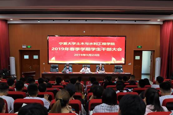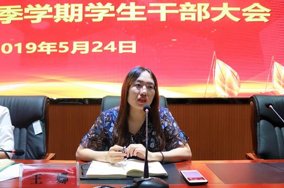 2019年春季学生干部大会在知行楼三阶报告厅隆重召开。学院党委副书记柳松洁,学生工作办公室老师王娜、蒋宇欢,以及团委学生会主席团、部长团成员,各班班委、支委参与此次大会。会议由蒋宇欢老师主持。