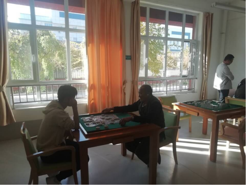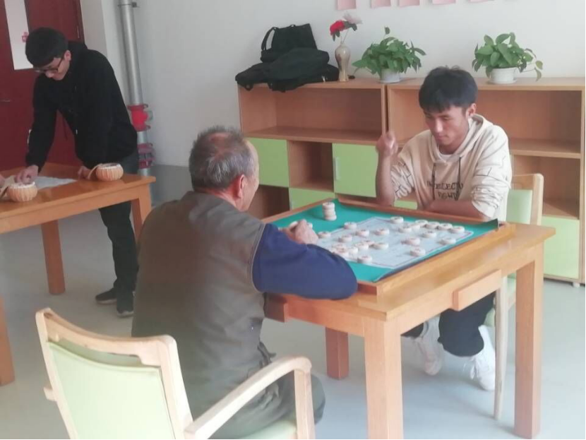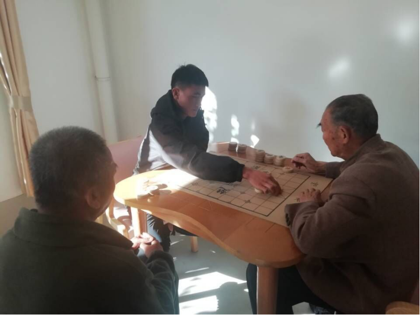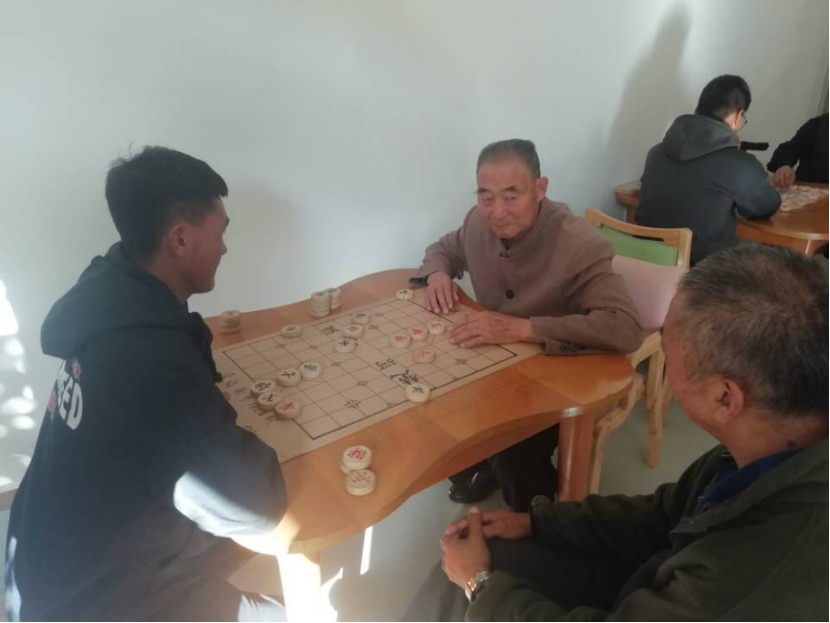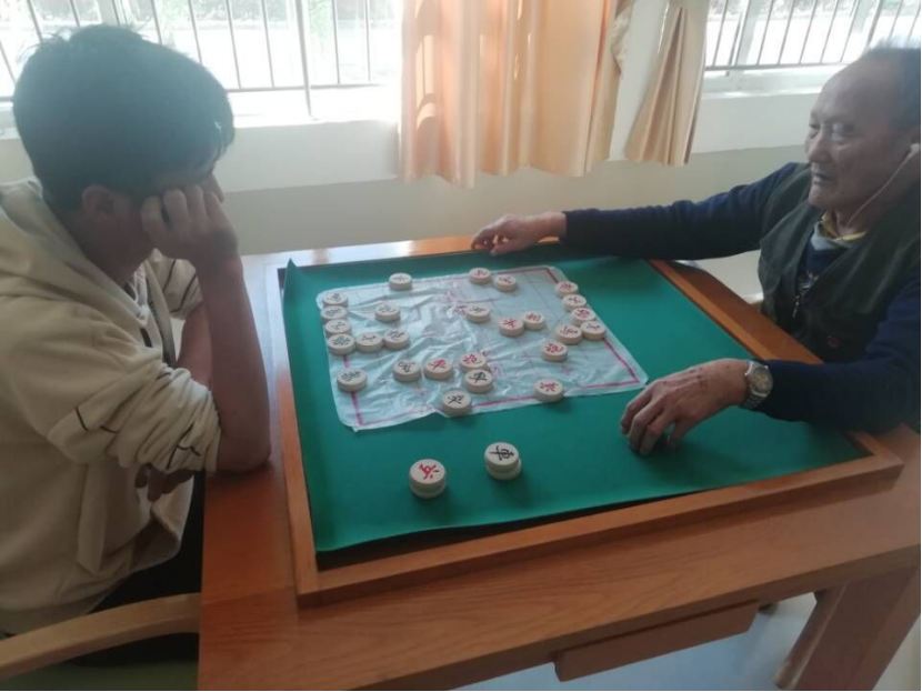 场内早早播放着音乐,吸引了行动自如的长者前来参与,而一些行动不便的长者也在护工协助下前来观赏。随着老人陆陆续续的到来,一场别开生面的棋局大战依次展开。大爷大妈打得很是卖力认真呢,开始他们紧皱眉头,慢慢舒缓,最后眉笑颜开。即使第一次见面,大家也是相处得十分融洽。在几个小时的棋局,最后的几分钟看出了他们的不舍。这不是良辰美景的虚设,而是又见梅花又见君的你。来自心灵的笑是真的,来自大家的陪伴是真的。请给老人微笑的理由,请让老人的期待不只是期待。