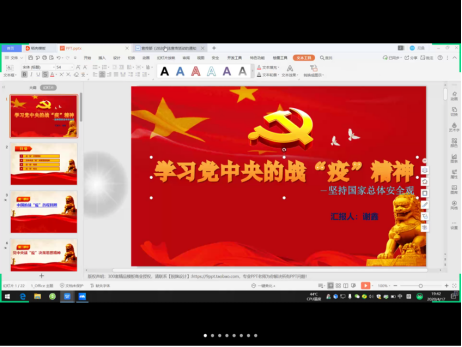 随后,谢鑫同志带领我们学习了党中央的战疫情精神,以视频和ppt的形式带领大家回顾此次为战胜疫情国家作出的相关措施及法宝,展示出了我们中国共产党集中统一领导下的优势。