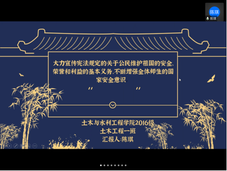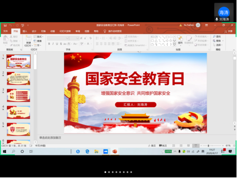 土木本科党支部利用腾讯会议进行“国家安全”主题党日活动。会议由组织委员虎攀智同志主持,土木本科党支部全体党员参与。