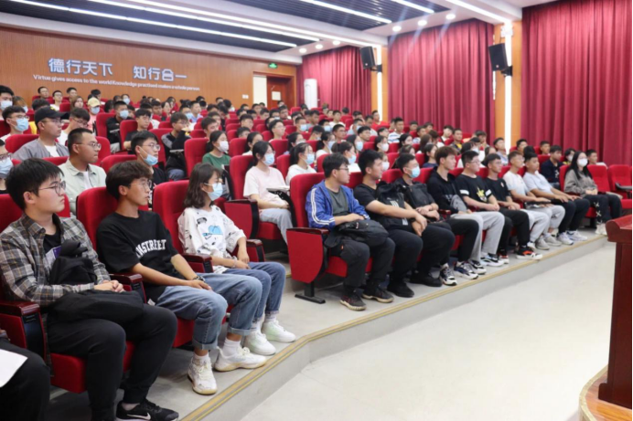 于知行楼三楼阶梯教室开展入党教育,2020级本科生辅导员何涛主持会议,2021级同学分两批参加。