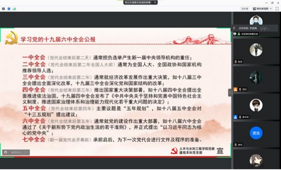 建规本科党支部开展了第二十三次党史学习教育暨党的十九届六中全会专题学习会,支部全体党员和入党积极分子通过线上方式参会,会议由党支部副书记贾浩主持。