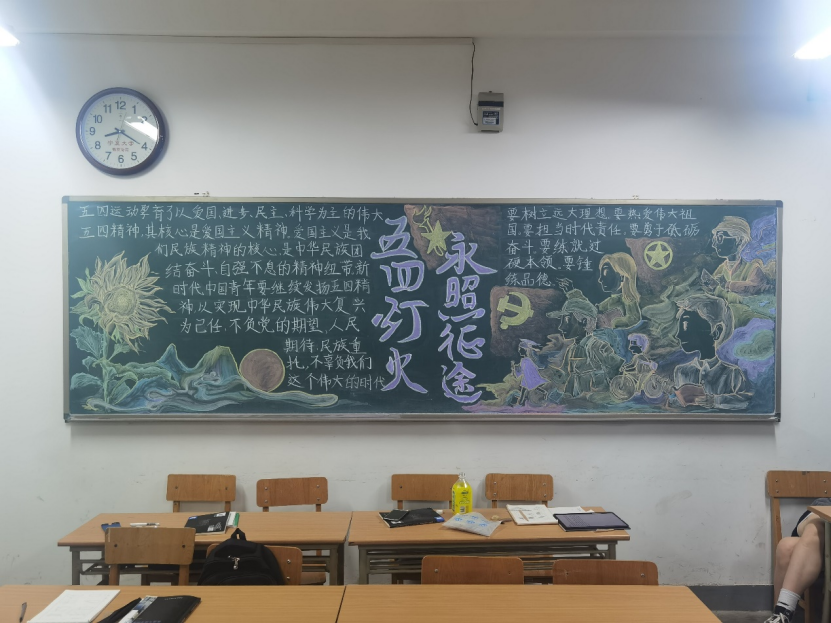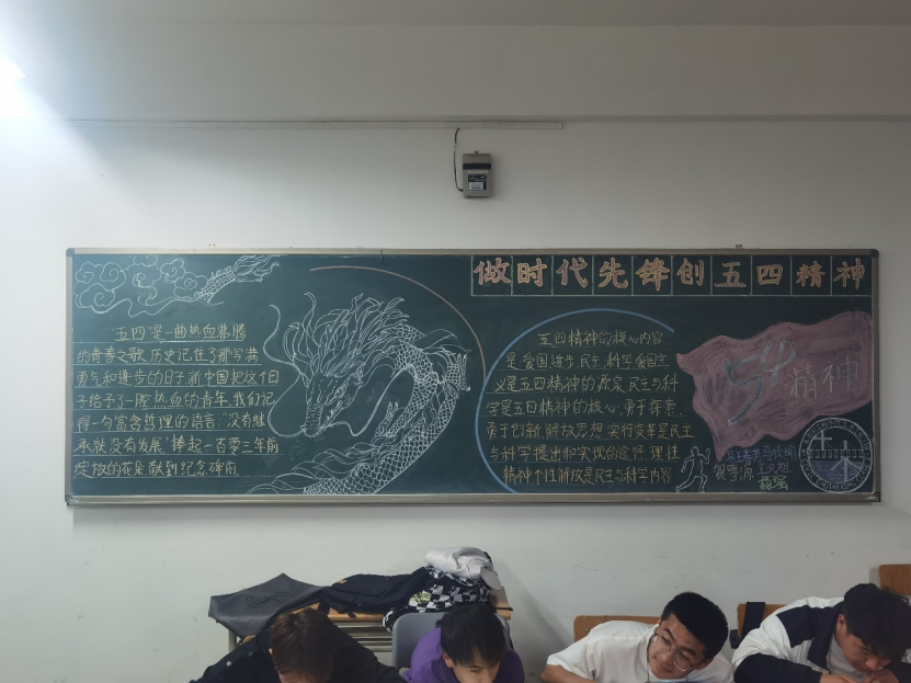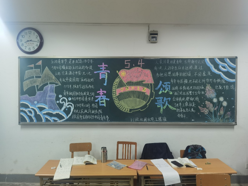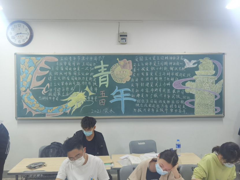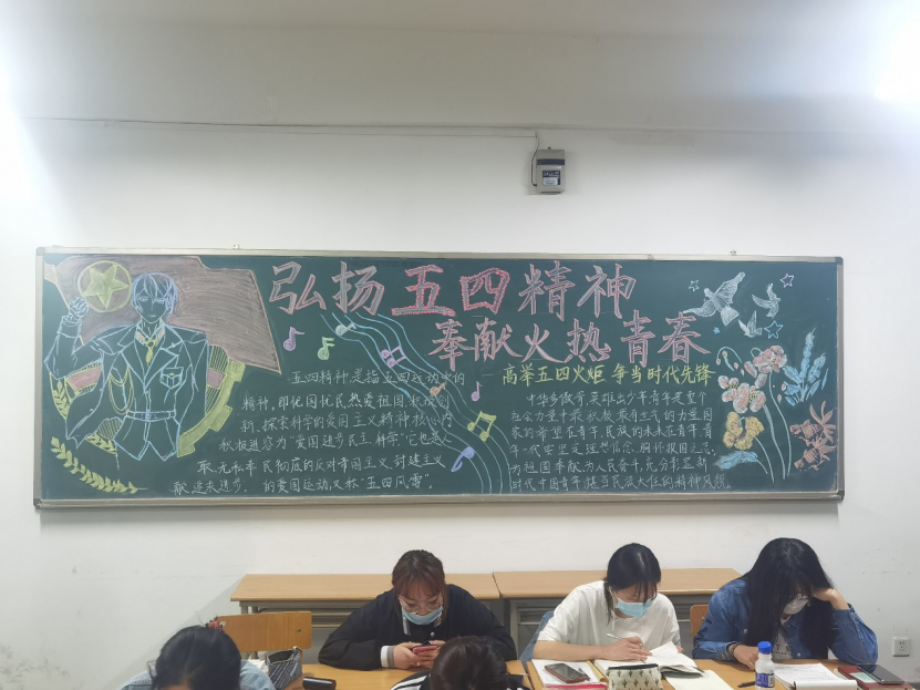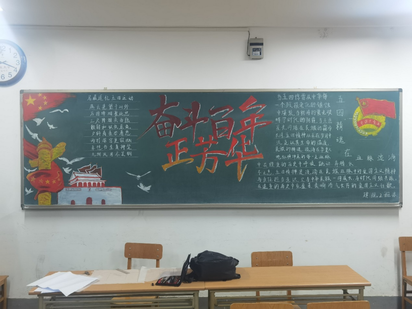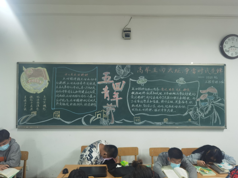 21级各班级积极围绕“弘扬五四精神”主题,齐心协力,对黑板报进行精心设计。一幅幅精美绝伦的黑板报作品,汇集了各班学生的集体智慧,也体现了同学们爱党爱国的热情。