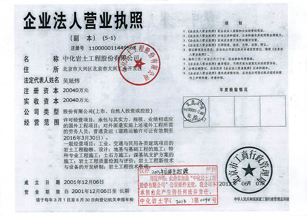中化岩土工程股份有限公司是从事地基与基础工程、岩土工程勘察的专业化企业,是节地、节能、绿色环保的强夯地基处理技术的领导企业、北京市高新技术企业。公司具有“地基与基础工程专业承包壹级”、“工程勘察(专业类岩土工程)甲级”、“特种专业工程承包”和“土石方工程承包”资质。经营业务范围为工业、交通与民用各类建设项目的岩土工程勘察、设计;地基与基础工程;特种专业工程;土石方工程;基坑支护;岩土工程质量检测与评价;岩土工程新技术与设备的开发研制;岩土工程技术咨询。
